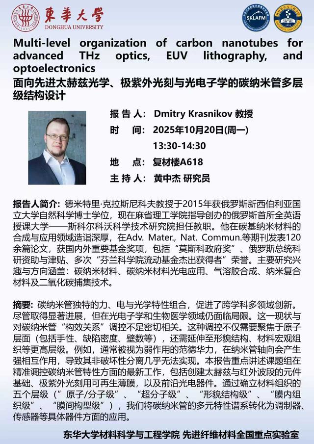 Dmitry Krasnikov--斯科尔科沃科学技术研究院--Multi-level organization of carbon nanotubes foradvanced THz optics,EUV lithography,andoptoelectronics
