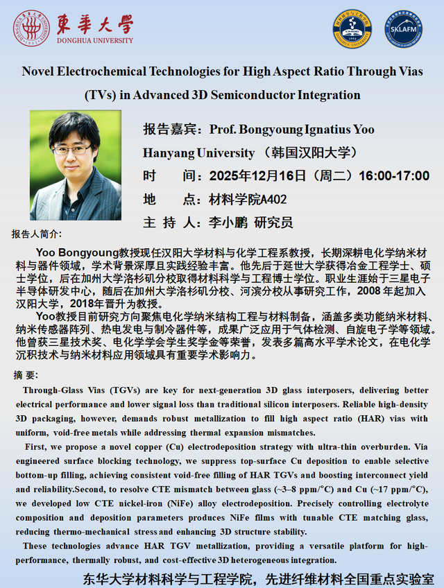 Bongyoung Yoo--Hanyang University(韩国汉阳大学)--Novel Electrochemical Technologies for High Aspect Ratio Through Vias(TVs)in Advanced 3D Semiconductor Integration