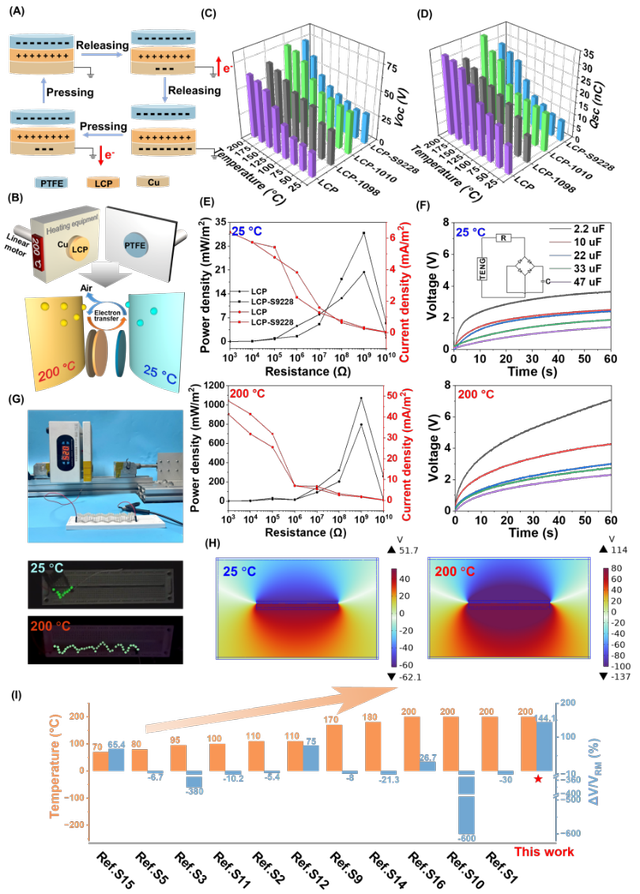 该材料通过一步熔融缩聚法制备,其高刚性芳环主链结构赋予摩擦纳米发电机(TENG)优异的热稳定性(图1),展现出LCP作为高温摩擦电材料的潜力。