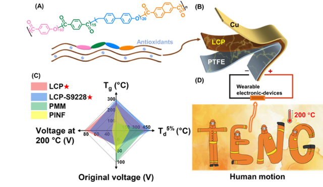 团队系统性地探索了LCP的多种卓越性能,并通过创新分子设计实现了多项突破,为极端环境能源装置提供了新策略,有望推动TENG在高温救援、防护装备及特种电子设备中的应用,为开发适用于极端环境的新一代高性能聚合物和先进TENG器件开辟了广阔道路,拓展可持续能源技术边界。